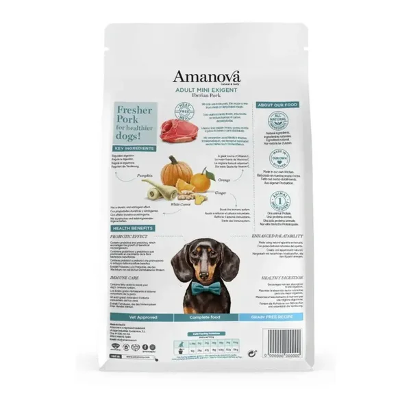 Amanova Adult Mini Exigent Iberian Pork is een exclusief recept dat geen vleesmeel of gedroogd vlees bevat, het is de perfecte keuze voor honden die in de categorie moeilijke eters vallen.