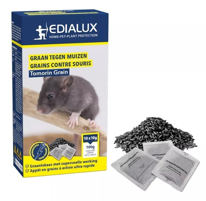 Tomorin Grain is een lokaas op basis van granen ter bestrijding van muizen in particuliere, publieke en agrarische gebouwen. Tomorin Grain is een klaar voor gebruik rodenticide verpakt in afzonderlijke zakjes. Zakjes in beveiligde lokaasdozen uitleggen.