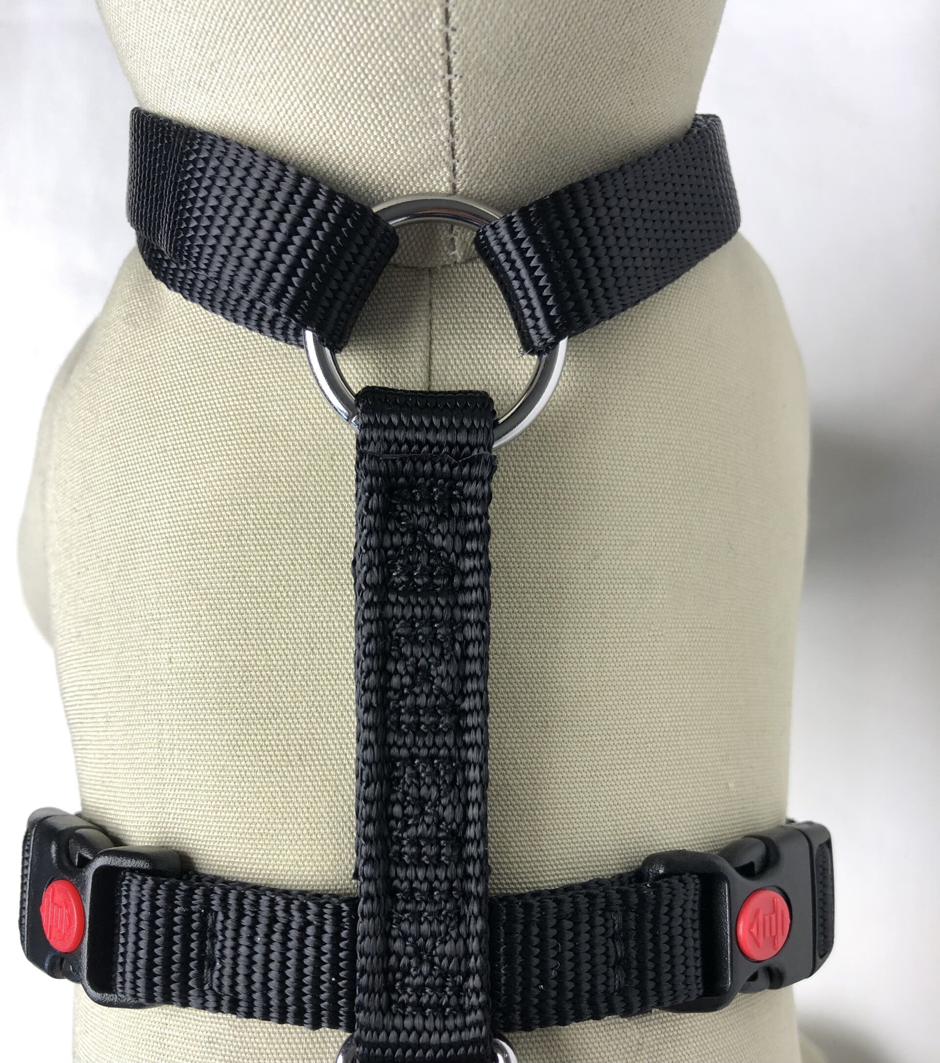 Borstuigje in nylon. Verstelbaar op drie verschillende plaatsen; bij de borst, onderaan de borst en bij de buikomtrek. Hierdoor is het ideaal voor honden die nog gaan groeien.